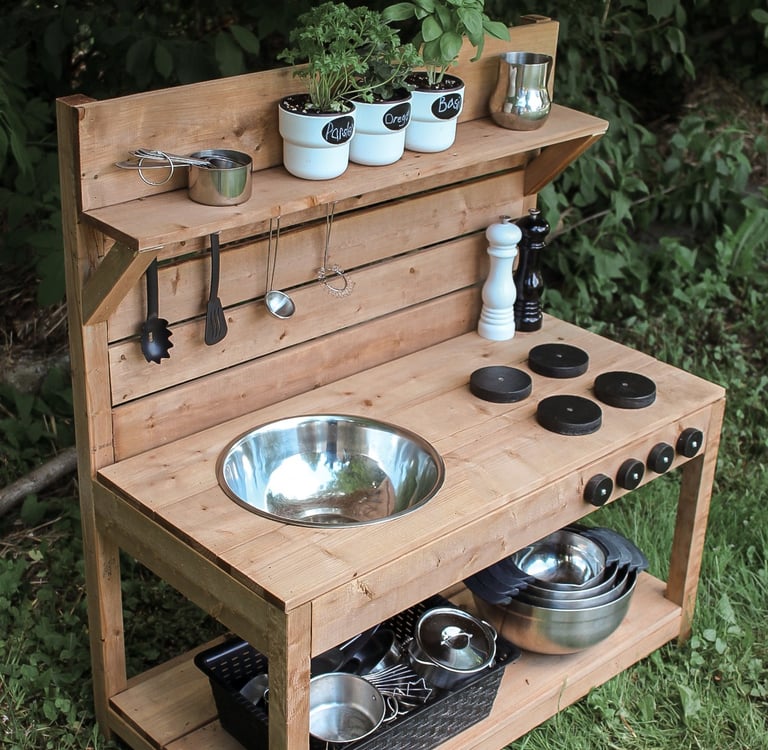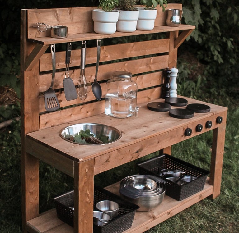 Our hand-crafted mud kitchens provide endless opportunities for creativity, sensory exploration, and imaginative adventures. Foster early STEM learning, fine-motor skills, and a love for the great outdoors.